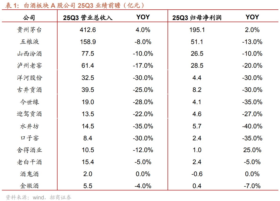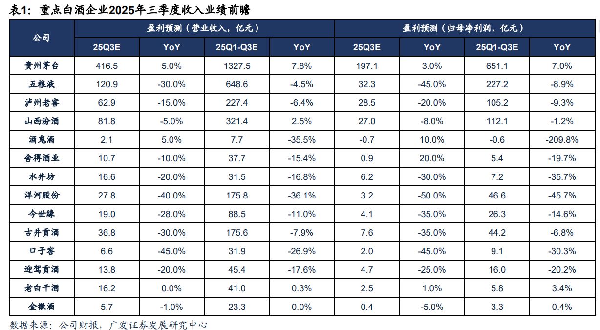 上周,广发证券发布《白酒持续调整,大众品表现分化——2025年三季报业绩前瞻》研报,对白酒上市公司三季度业绩进行了详细预测分析。总体来看,广发证券认为,步入8月后,随着政策在执行层面的规范与完善,白酒需求环比有所改善,但同比仍承压。从经销商回款进度看,预计厂商博弈下,多数厂家放松回款要求/不再强制性要求打款,部分头部酒企表现相对较优。