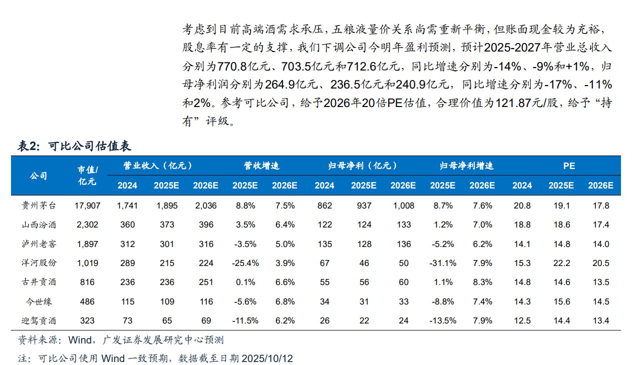 而同样是分析主动调整,相比之下,招商证券的预测则要温和许多——五粮液多数经销商全年任务完成率较去年同期慢10%左右,前期普五批价较低导致经销商回款意愿较弱,近期酒厂返利与补贴力度加大,经销商信心有所提振,双节动销略好于竞品;预计2025年三季度报表调整幅度环比扩大,利润由于价格/补贴因素下滑高于收入,预计五粮液三季度收入和利润同比减少8%和13%,报表进入出清。