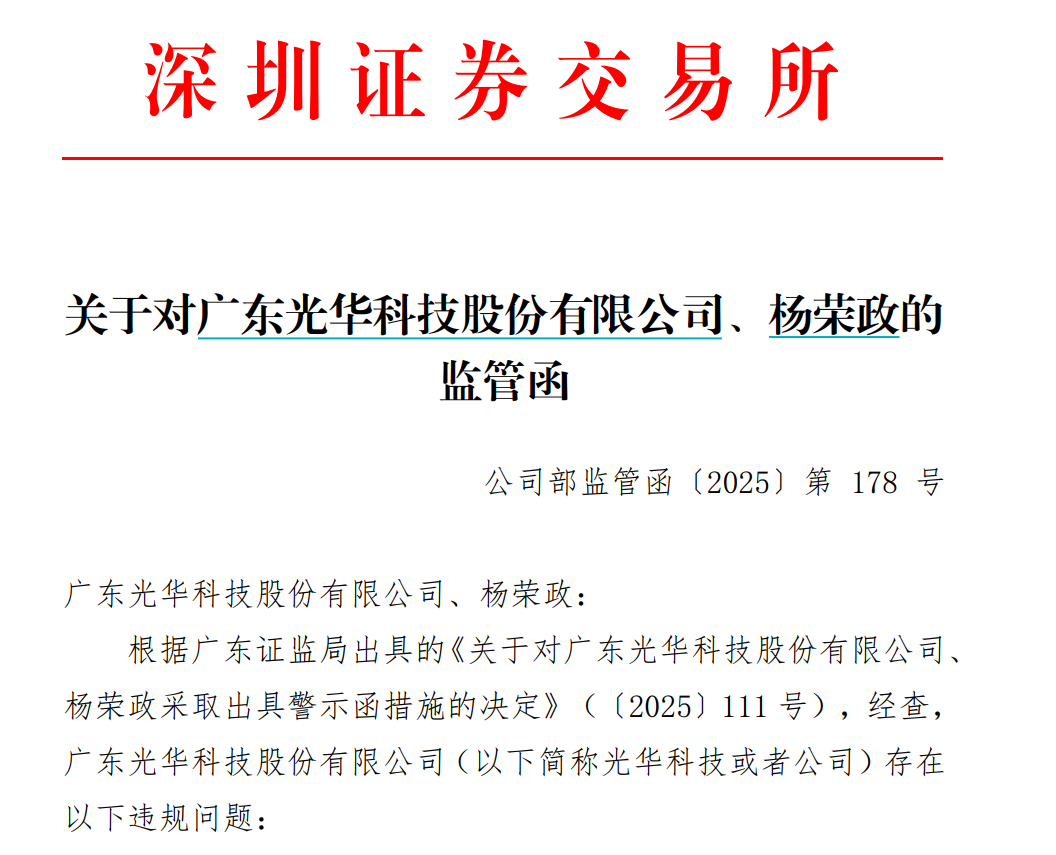 同期,深交所就相同事由对光华科技及杨荣政下发监管函,要求光华科技及全体董事、高级管理人员认真吸取教训,真实、准确、完整、及时、公平地履行信息披露义务,杜绝此类事件发生。
