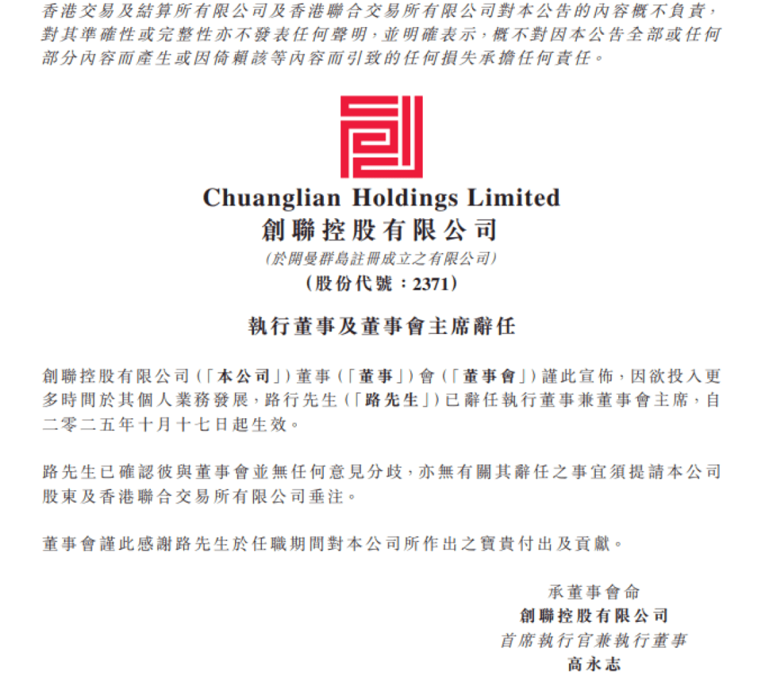 10月17日,创联控股有限公司(创联控股,02371.HK)公告执行董事及董事会主席辞任。公告称,路行因欲投入更多时间于其个人业务发展,已辞任创联控股有限公司执行董事兼董事会主席,辞任自2025年10月17日起生效。