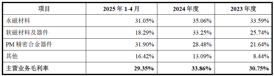 值得注意的是,金南磁材毛利率呈现过山车走势。2023年,公司主营业务毛利为30.75%,2024年增至33.86%,2025年前4月降至29.35%。公告指出,“永磁材料2024年毛利率较高系原材料铁氧体磁粉2024 年采购价格短期下滑所致”。