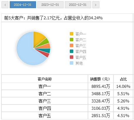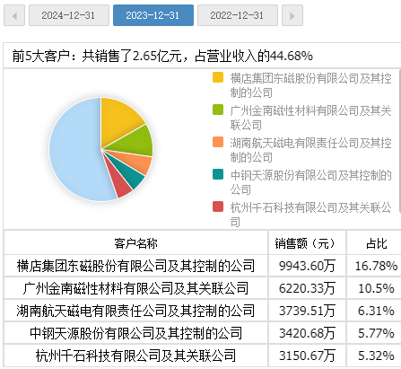 作为新三板挂牌公司,安特磁材也会定期披露前五大客户,相关信息显示:2023 年,安特磁材披露的第二大客户为 “金南磁材及其关联公司”,销售金额为 6220.33 万元,而同期金南磁材披露的对安特磁材采购金额为 5271.08 万元,两者差额高达 949.25 万元,偏差比例达到 18%;2024年,安特磁材披露的前两大客户销售额分别为 8895.41 万元和 3488.17 万元,均与金南磁材披露的 7235.69 万元采购额存在差异。