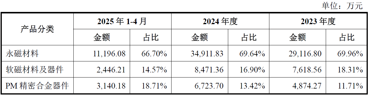 金南磁材在2023年、2024年和2025年前四月收入分别为4.18亿元、5.02亿元和1.68亿元,同期扣非后归母净利润分别为5244.78万元、8146.16万元和2113.83万元。