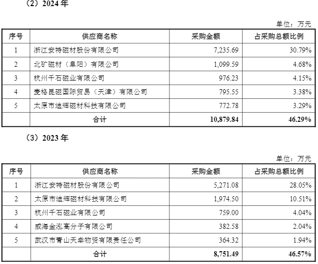 新莱福公告显示,2023年和2024年,金南磁材的第一大供应商均为新三板上市公司浙江安特磁材股份有限公司(下称 “安特磁材”)。其中,2023 年金南磁材向安特磁材的采购金额为5271.08万元,2024年进一步增至7235.69万元,该采购额占金南磁材总采购金额的比例约30%,对其成本控制具有决定性影响。