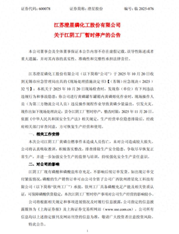 10月21日,澄星股份(600078)发布公告,因江阴工厂在2025年10月20日的现场检查中发现违法违规行为和事故隐患,公司进行黄磷罐车罐箱内黄磷熔化作业时,现场操作人员(为第三方物流公司人员)违反操作规程作业导致黄磷少量溢出,引发火灾,无锡市应急管理局责令暂时停产,整改时限至2025年11月20日。