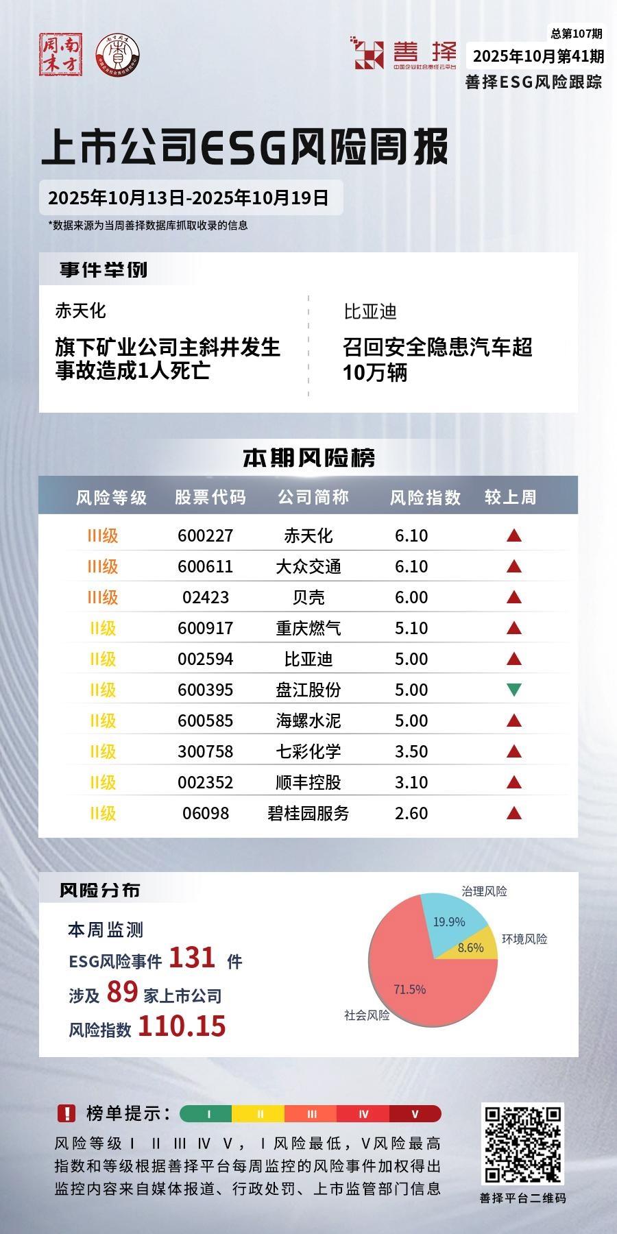 2025年10月第2周,89家上市公司曝光风险事件131起,风险指数110.15,其中治理风险占19.9%,环境风险占8.6%,社会风险占71.5%。赤天化(600227)、大众交通(600611)ESG风险级别达到Ⅲ级。赤天化旗下矿业公司主斜井发生事故造成1人死亡、比亚迪召回安全隐患汽车超10万辆等重大风险事件值得关注。