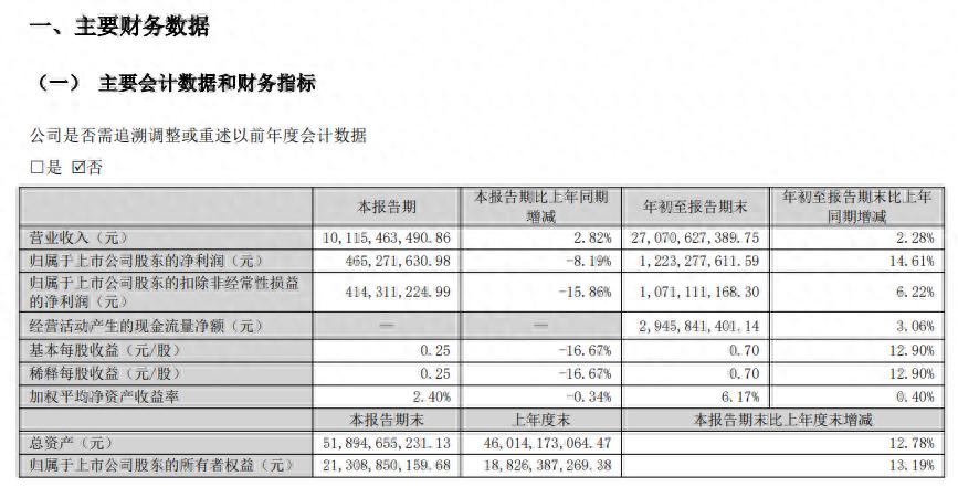 其中第三季度,公司营业收入为101.15亿元,同比上升2.82%;归母净利润为4.65亿元,同比下降8.19%;扣非归母净利润为4.14亿元,同比下降15.86%。