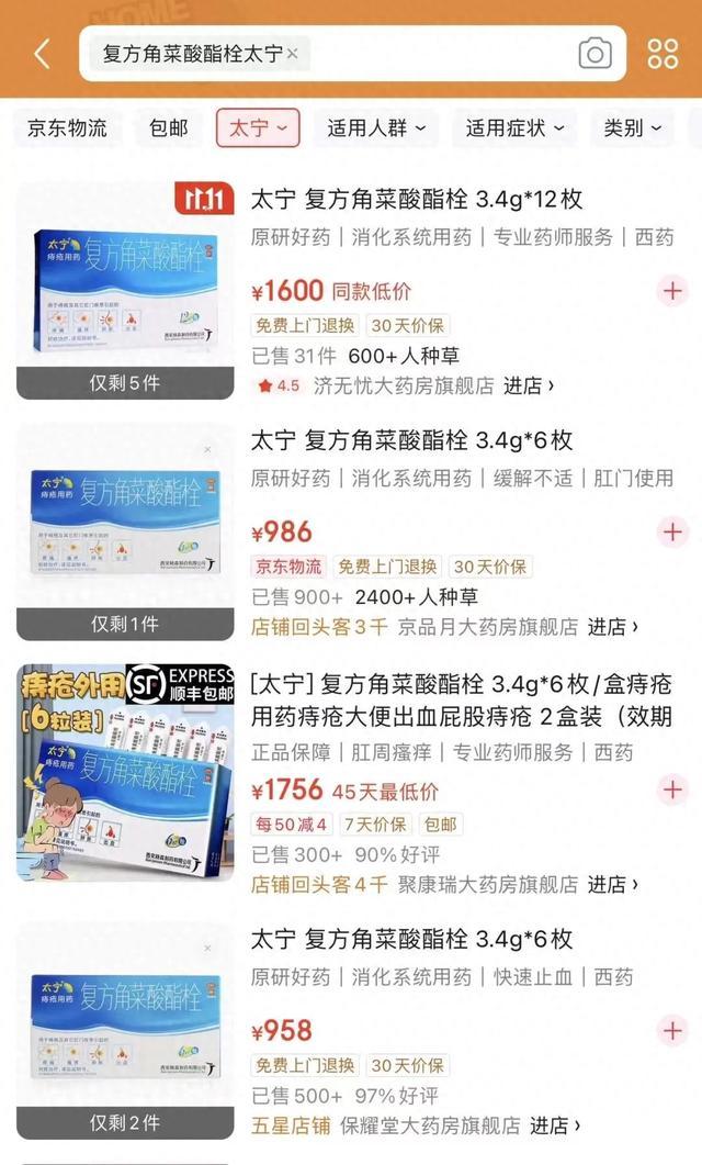 10月21日,红星资本局注意到,尽管已经停产两年,部分电商平台仍有太宁栓在售,不过价格较高且数量不多。例如,京东App显示,多家药房3.4g×6枚/盒的太宁栓售价在856元至966元不等,3.4g×12枚/盒的价格最低为1600元。有药房客服向红星资本局表示,其在售的太宁栓有效期到2026年4月。