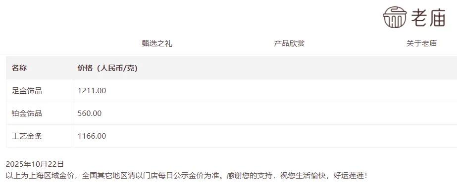 老庙黄金报价1211元/克,较前一日下跌83元/克;