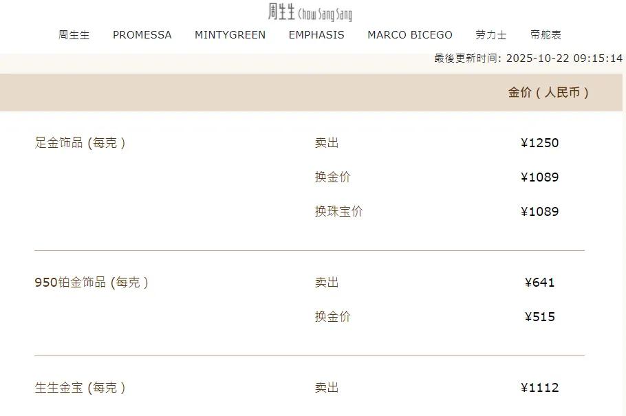 周生生足金饰品报价1250元/克,较前一日下跌39元/克;