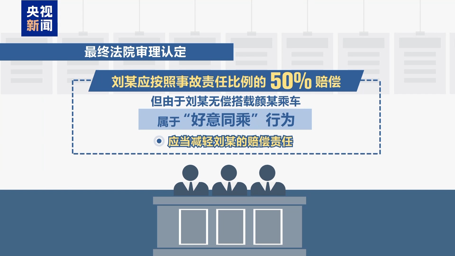 最终法院审理认定,颜某损失共计15万余元,由保险公司在交强险限额内赔偿颜某14万余元;其余部分,由保险公司按照事故责任比例的50%赔偿9467元,刘某应按照事故责任比例的50%赔偿,但由于刘某无偿搭载颜某乘车,属于“好意同乘”行为,应当减轻刘某的赔偿责任,法院认定刘某承担30%的赔偿责任,赔偿颜某5680元。