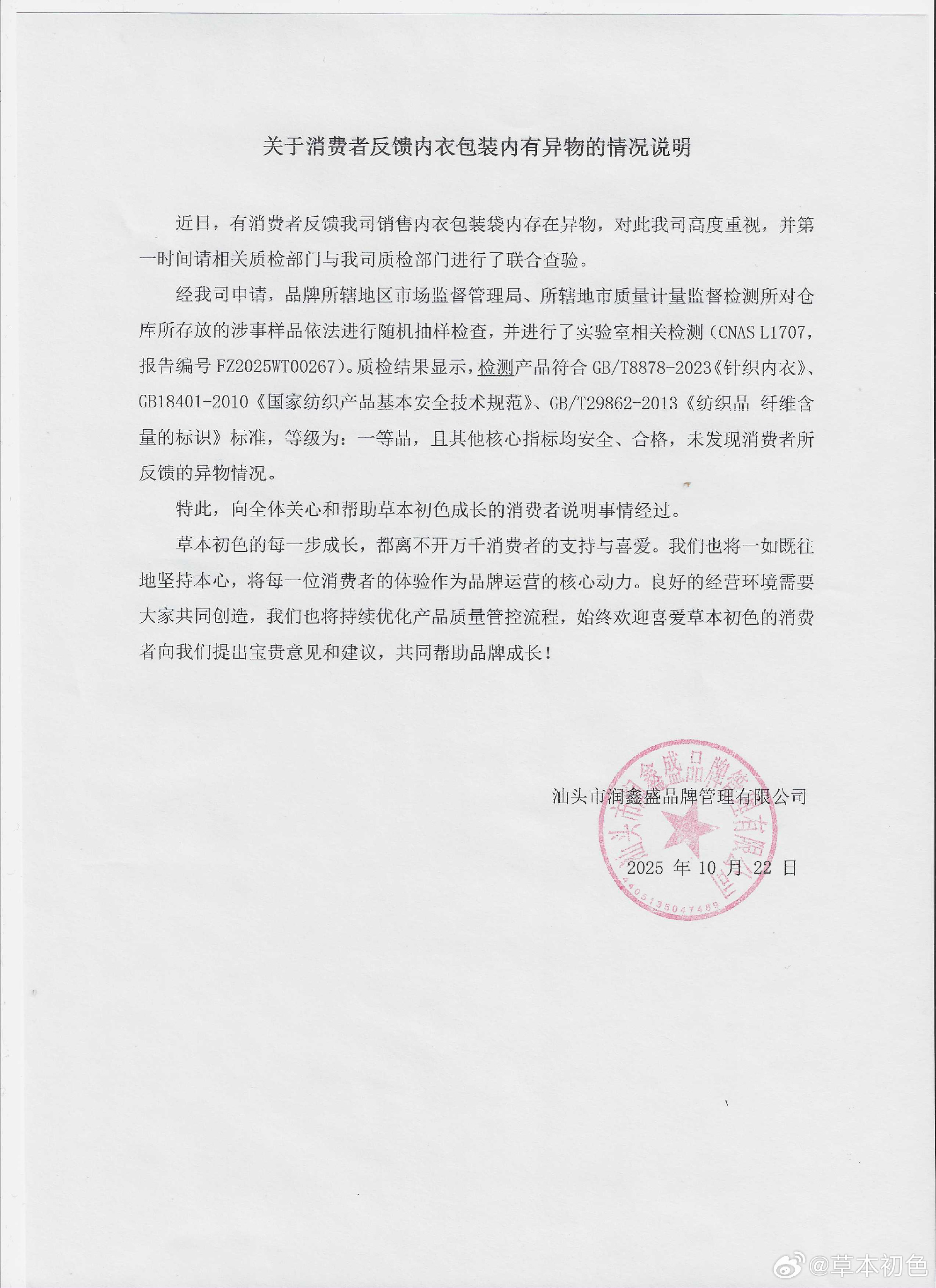 草本初色10月22日发布情况说明:经申请,品牌所辖地区市场监督管理局、所辖地市质量计量监督检测所对仓库所存放的涉事样品依法进行随机抽样检查,并进行了实验室相关检测。质检结果显示,检测产品符合 GB/T8878-2023《针织内衣》、GB18401-2010《国家纺织产品基本安全技术规范》、GB/T29862-2013《纺织品 纤维含量的标识》标准,等级为:一等品,且其他核心指标均安全、合格,未发现消费者所反馈的异物情况。