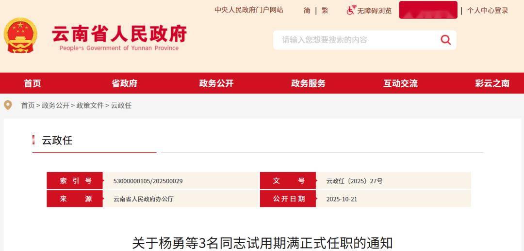 云南省人民政府微信公众号10月22日消息,云南省人民政府发布关于杨勇等3名同志试用期满正式任职的通知。其中,省人民政府决定:潘永军任省煤田地质局局长。