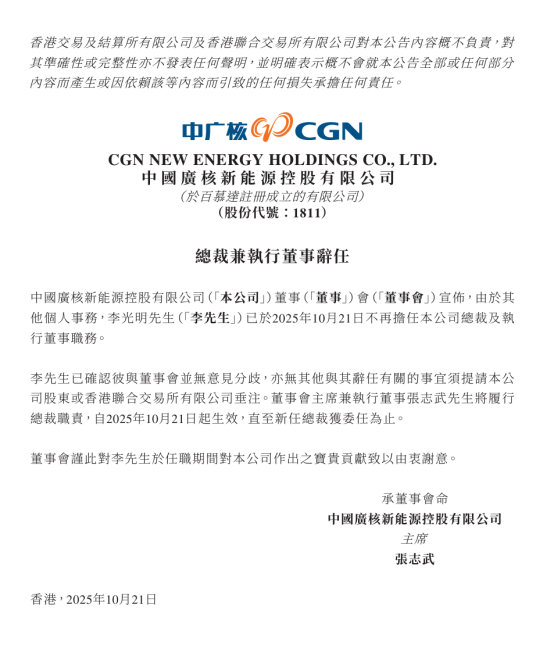中广核新能源发布公告称,公司董事会宣布,由于其他个人事务,李光明先生于2025年10月21日不再担任公司总裁及执行董事职务。董事会主席兼执行董事张志武先生将履行总裁职责,自2025年10月21日起生效,直至新任总裁获委任为止。