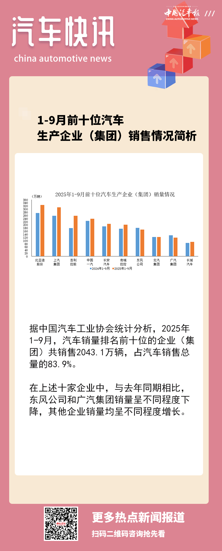 据中国汽车工业协会统计分析,2025年1-9月,汽车销量排名前十位的企业(集团)共销售2043.1万辆,占汽车销售总量的83.9%。