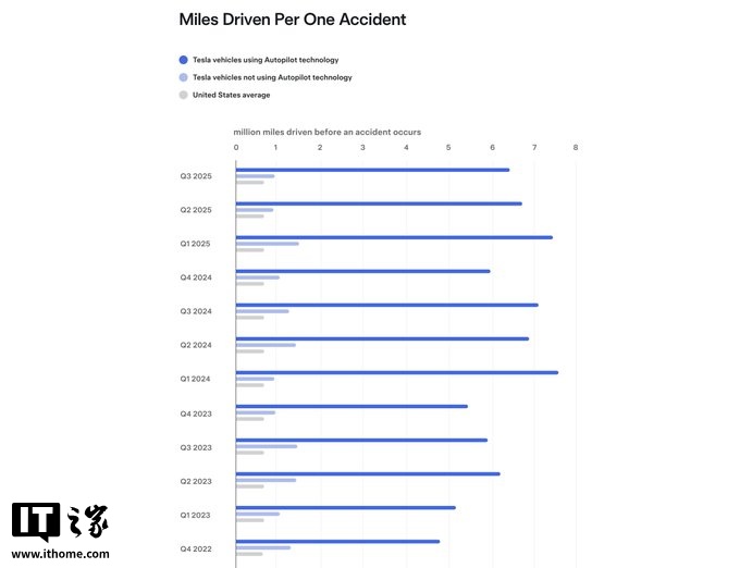 报告显示,在驾驶员启用 Autopilot 的情况下,每行驶 636 万英里(IT之家注:约 1023.5 万公里)才发生一次交通事故。