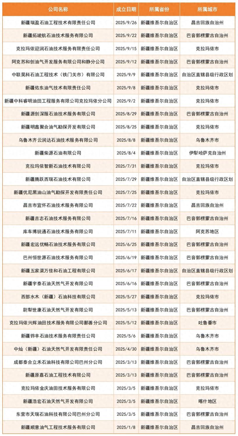 天眼查信息显示,2025年以来,仅新疆地区就新成立了32家油气公司。