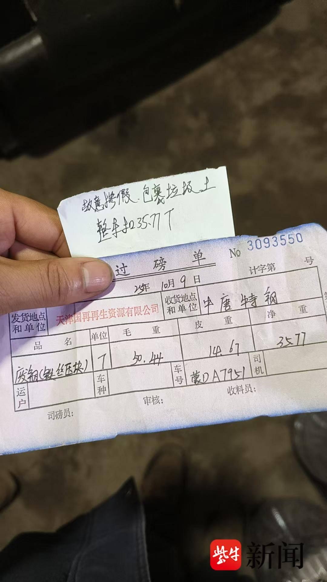 “10月7日,我请了货车到济宁这家回收公司装货,两天1000多公里的路程,司机将收购的废铁丝压块运到了中唐特钢。没想到,中唐特钢在验完货后,发现里面掺有土和垃圾,直接告诉运货的司机,这批废铁丝压块要被没收,还开具了没收的单据。”张瑞井告诉扬子晚报紫牛新闻记者,和她以往跟其他钢厂办理业务流程不同的是,多数钢厂都是先验货再卸货交易,中唐特钢却是先卸货再验货。
