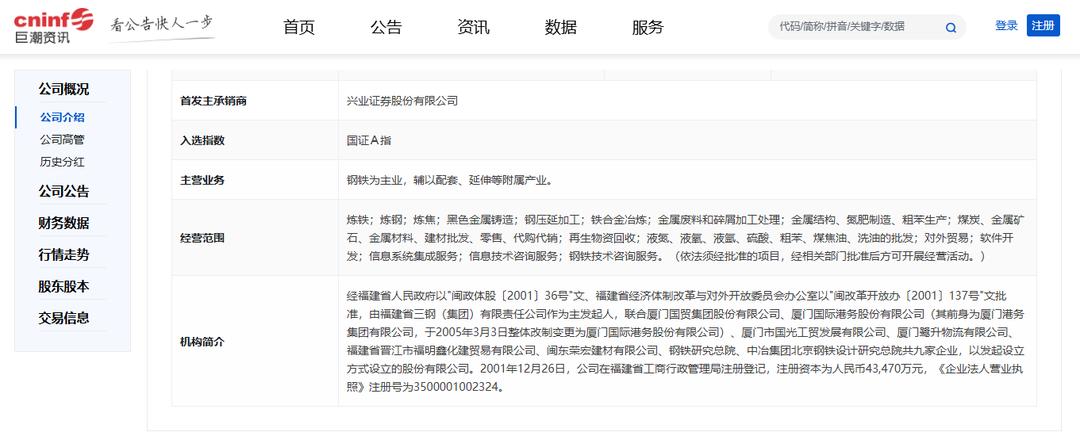 三钢闽光由福建省三钢(集团)有限责任公司作为主发起人,联合厦门国贸集团股份有限公司、厦门国际港务股份有限公司(其前身为厦门港务集团有限公司,于2005年3月3日整体改制变更为厦门国际港务股份有限公司)、厦门市国光工贸发展有限公司、厦门鹭升物流有限公司、福建省晋江市福明鑫化建贸易有限公司、闽东荣宏建材有限公司、钢铁研究总院、中冶集团北京钢铁设计研究总院共九家企业,以发起设立方式设立的股份有限公司。