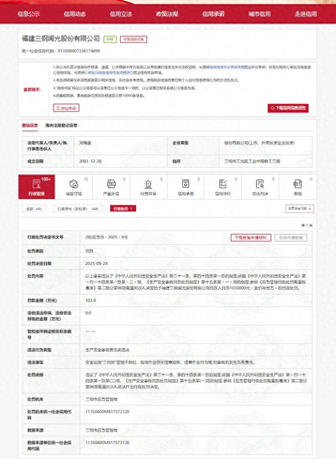 记者从信用中国获悉,福建三钢闽光股份有限公司(三钢闽光 002110)因生产安全事故责任类违法,被三明市应急管理局罚款103万元。