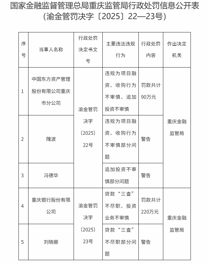 东方资产重庆分公司、重庆银行分别领罚!重庆金融监管局开具罚单,涉三人违规合计罚310万