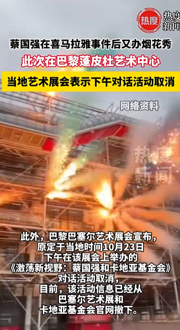 此外,巴黎巴塞尔艺术展会宣布,原定于当地时间10月23日下午在该展会上举办的《激荡新视野:蔡国强和卡地亚基金会》对话活动取消。