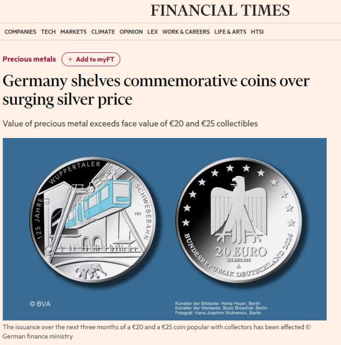 随着本月白银价格来到高位,德国财政部叫停了发行两枚纪念币的计划,因为它们所含白银的成本已超过其面值。
