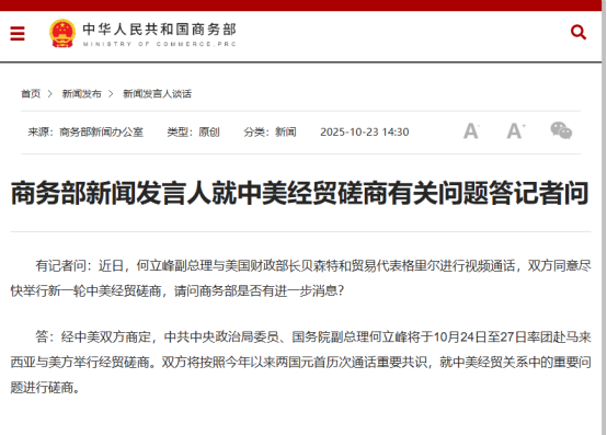 有记者问:近日,何立峰副总理与美国财政部长贝森特和贸易代表格里尔进行视频通话,双方同意尽快举行新一轮中美经贸磋商,请问商务部是否有进一步消息?