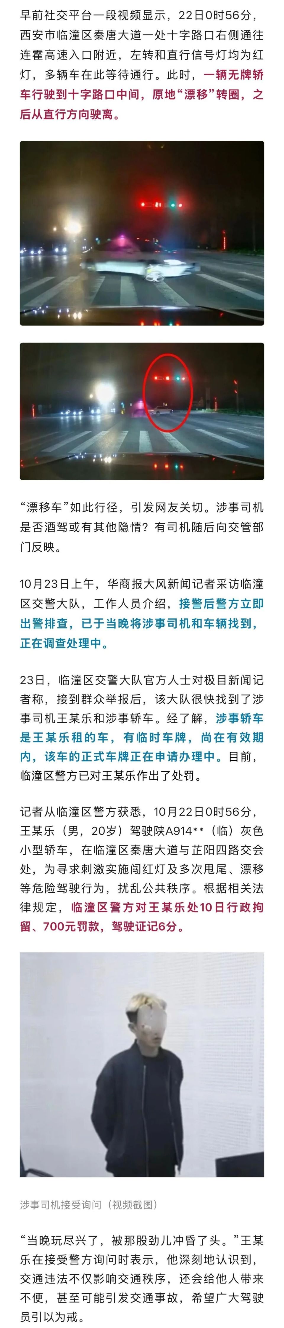 10月22日凌晨,一辆未挂车牌的轿车在西安临潼区十字路口漂移,引发关注。23日,记者从临潼区警方获悉,涉事司机被处10日行政拘留、700元罚款,驾驶证记6分。