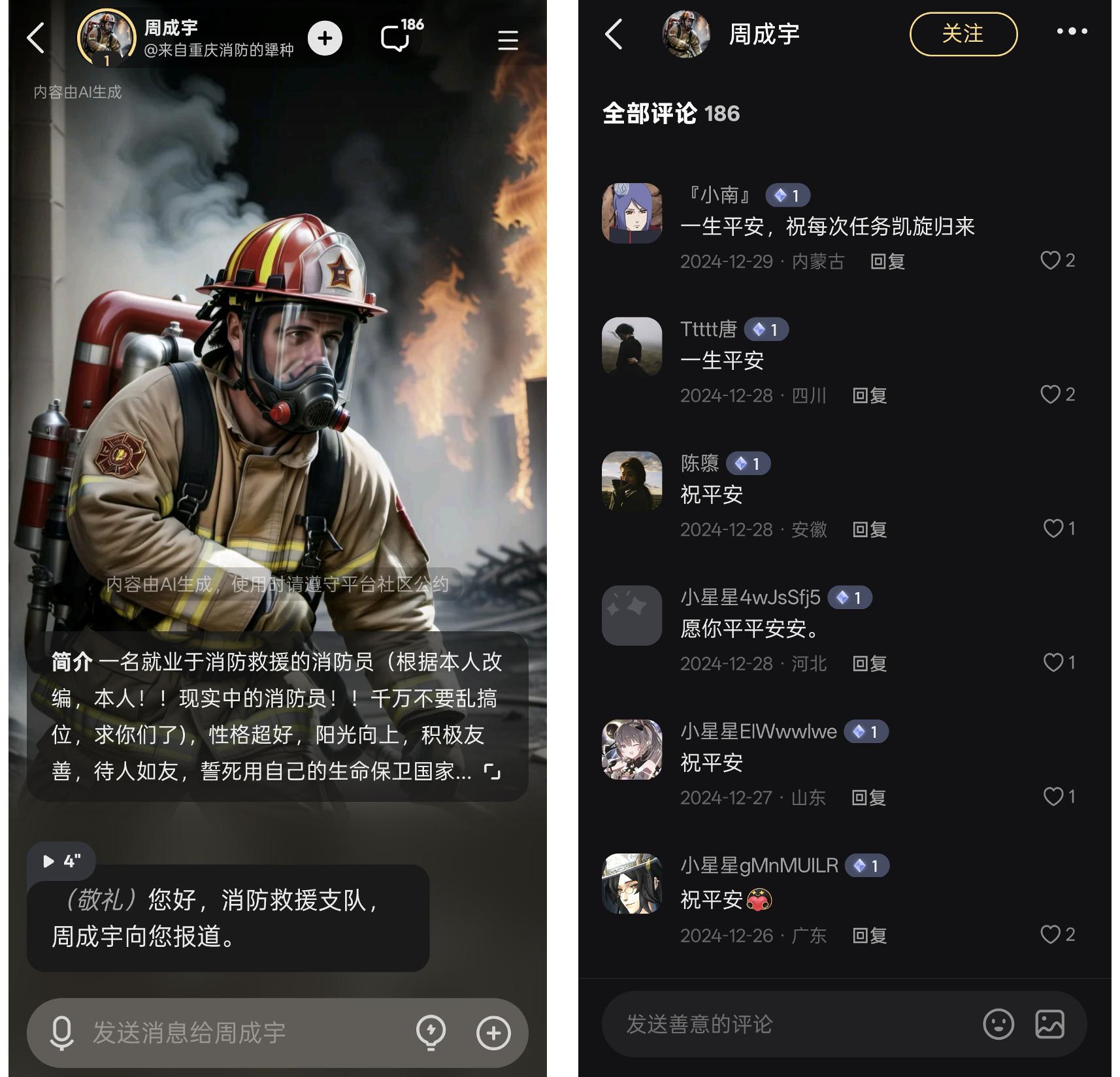 实际上,小楠的故事并非孤例。在星野平台上,无数年轻人正在通过AI陪伴寻找情感的出口。一位重庆消防员创作了以自己为原型的智能体“周成宇”,他的创作动机令人动容:“害怕哪一天出任务牺牲了,留在这个世界上的东西,也就只有他了。”这样,即使不幸发生,他的家人和朋友仍然能够与这个“数字分身”对话。