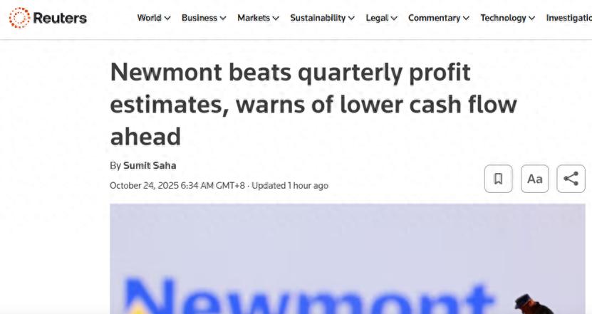 报道还提到,全球最大的黄金生产商纽蒙特矿业公司周四发布的第三季度利润数据超过华尔街预期,创纪录的黄金价格在一定程度上抵消了其产量下降的趋势。对此,纽蒙特公司表示,截至9月30日的三个月里,其平均黄金价格为每盎司3539美元,比一年前的2518美元有所提高。