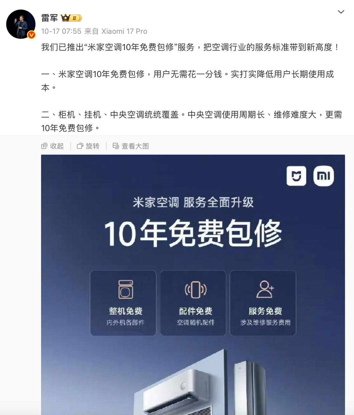 10月17日,小米创始人雷军在微博宣布,米家空调推出10年免费包修,把空调行业服务标准带到新高度。记者发现,这远高于行业普遍的6年包修。 根据官方说明,承诺范围涵盖整机包修、上门服务、人工费、检测费、配件更换及加氟等。