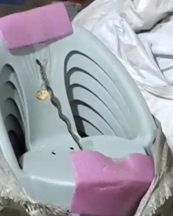 李女士的家人回忆,网购的塑料小凳是从贵州发货的,孩子拆开包裹时,突然发现一条蛇被胶带固定在椅子上。