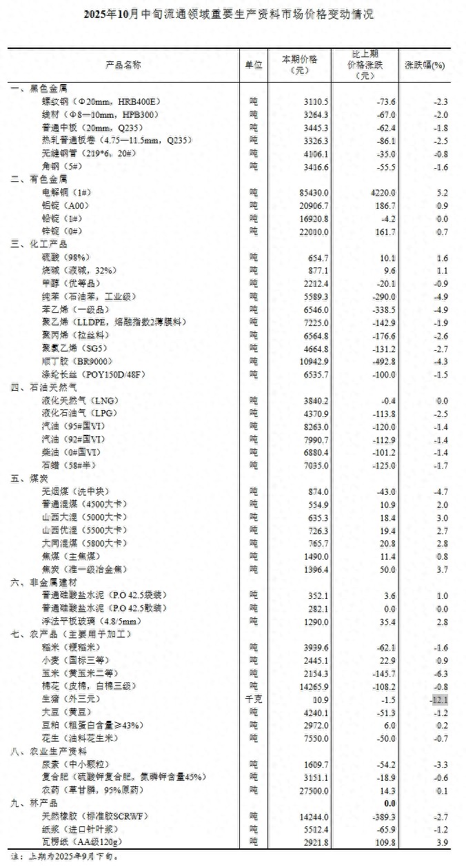 据对全国流通领域9大类50种重要生产资料市场价格的监测显示,2025年10月中旬与9月下旬相比,17种产品价格上涨,30种下降,3种持平。