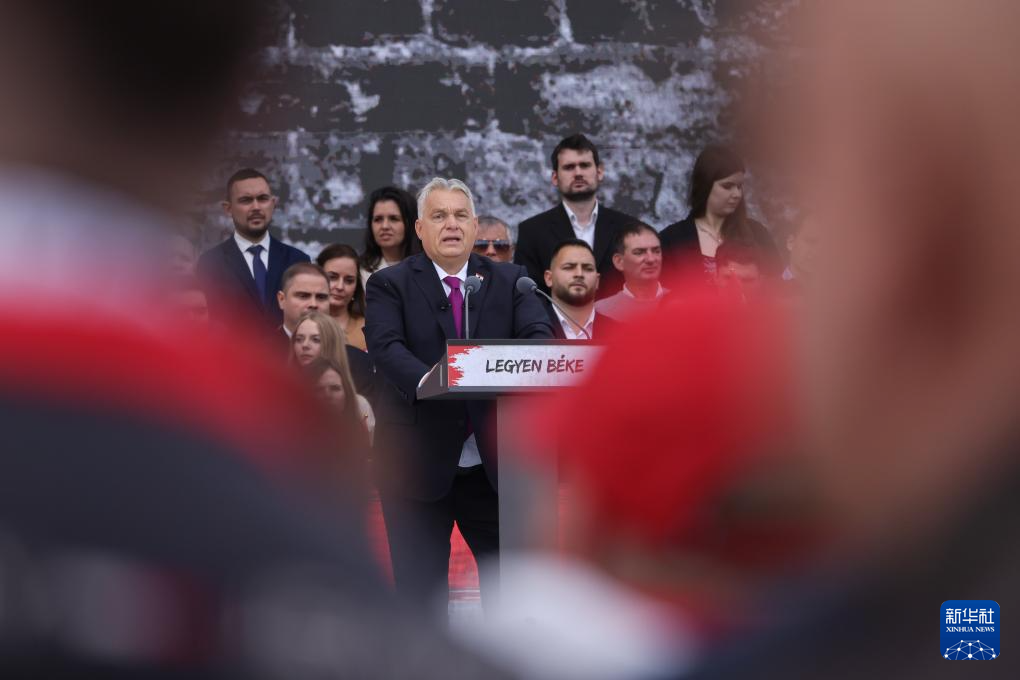 10月23日,匈牙利总理欧尔班(前右)在首都布达佩斯举行的一场集会上讲话。新华社发(弗尔季·奥蒂洛摄)