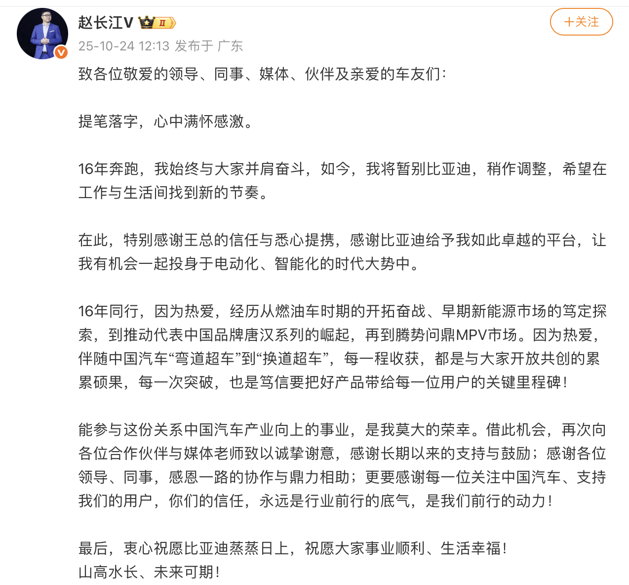10月24日,比亚迪腾势方程豹直营事业部总经理赵长江在社交媒体发文称,“将暂别比亚迪,稍作调整,希望在工作与生活间找到新的节奏”。他还在文中感谢了比亚迪董事长王传福。