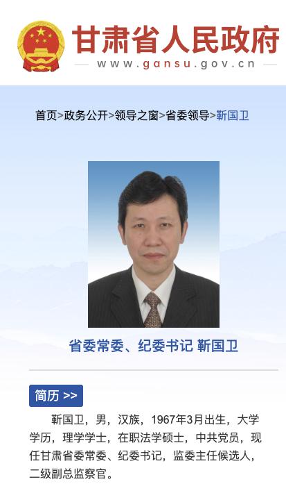 甘肃省政府网站“领导之窗”信息更新显示,靳国卫已任甘肃省委常委、纪委书记,监委主任候选人,二级副总监察官。