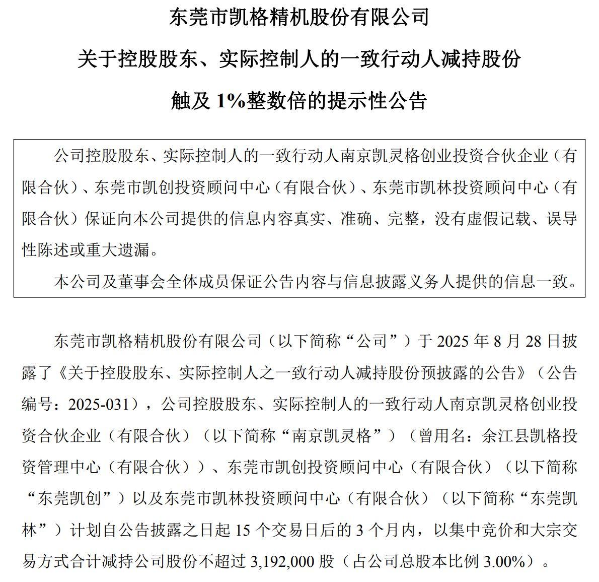 公告显示,凯格精机控股股东、实际控制人邱国良的一致行动人——南京凯灵格创业投资合伙企业(有限合伙)(以下简称“南京凯灵格”)、东莞市凯创投资顾问中心(有限合伙)(以下简称“东莞凯创”)和东莞市凯林投资顾问中心(有限合伙)(以下简称“东莞凯林”)计划自公告披露之日起15个交易日后的3个月内(即2025年9月19日至12月18日),通过集中竞价交易和大宗交易方式合计减持公司股份不超过319.2万股,占公司总股本的3.00%。减持原因是“基于平台员工个人资金需求”。