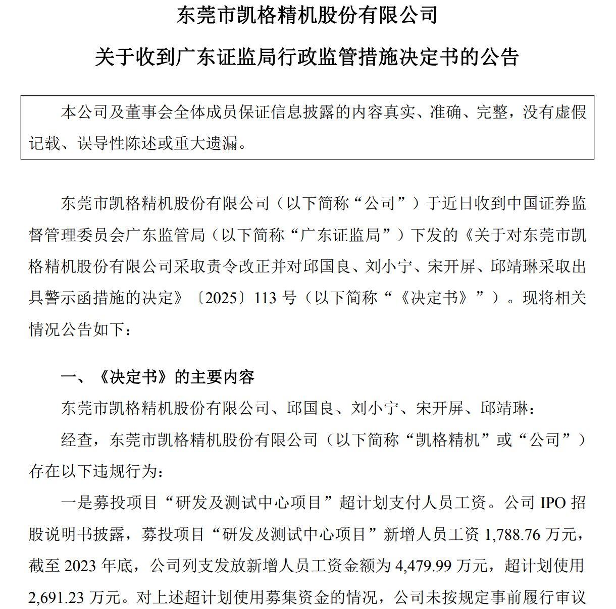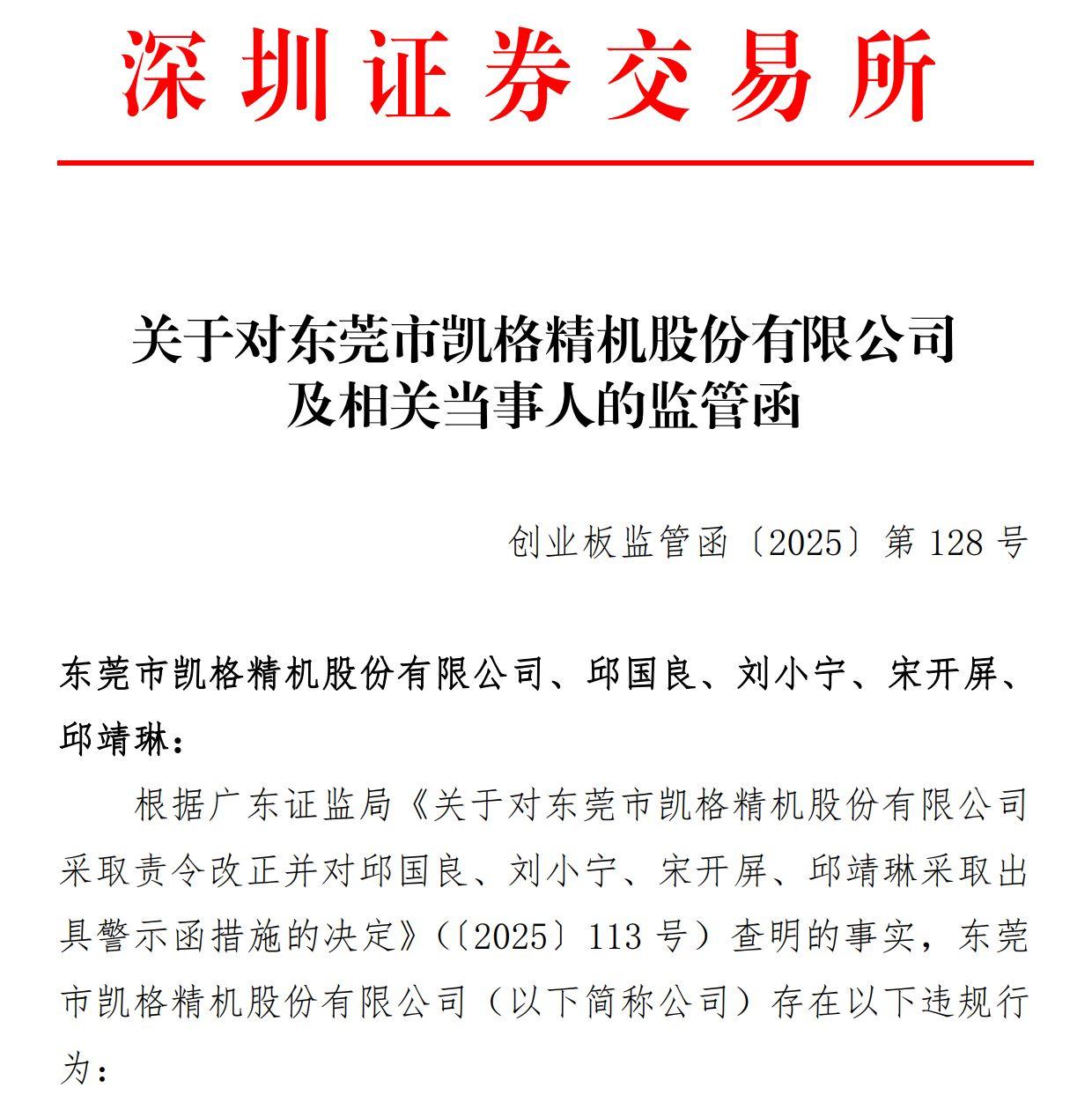 根据广东证监局下发的行政监管措施决定书,凯格精机董事长邱国良、时任总经理刘小宁、时任财务总监宋开屏、董事会秘书邱靖琳未勤勉尽责,被认定对公司违规行为负有主要责任。