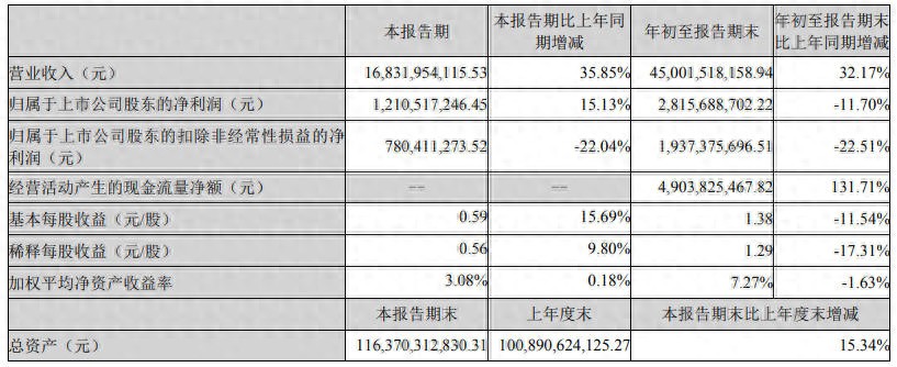 第三季度,公司实现营业总收入168.32亿元,创下单季历史新高,同比增长35.85%;实现归母净利润12.11亿元,同比增长15.13%。