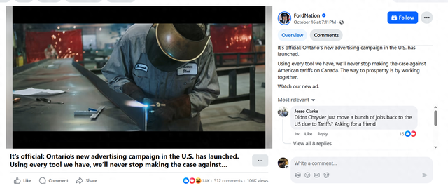 今年10月14日,安大略省省长道格·福特(Doug Ford)曾表示,该省将在美国花费7500万美元投放这则里根批评关税的广告。10月16日,道格·福特就在各大社交平台上公开发布了这则广告。