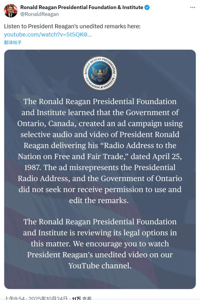 “罗纳德·里根基金会刚刚宣布,加拿大非法使用了一则广告,该广告是伪造的,内容是罗纳德·里根对关税发表负面评价。”