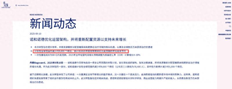 先是在7月,默沙东启动6000 人裁员计划,覆盖行政、销售及研发部门,作为 “2027 年前年省 30 亿美元” 战略的核心,预计每年直接降本 17 亿美元。之后在9月,诺和诺德宣布全球裁员9000 人,占总人数 11%,超半数岗位来自丹麦总部,目标是 2026 年底实现年节省 12.6 亿美元。