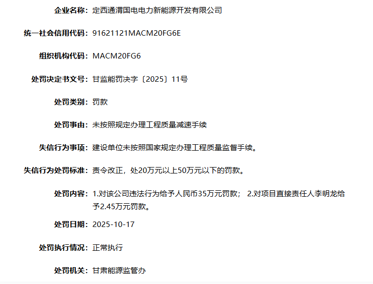 近日,国家能源局资质和信用信息系统披露处罚信息显示,定西通渭国电电力新能源开发有限公司因未按照规定办理工程质量减速手续,被甘肃能源监管办罚款35万元。同时,对项目直接责任人李明龙给予2.45万元罚款。