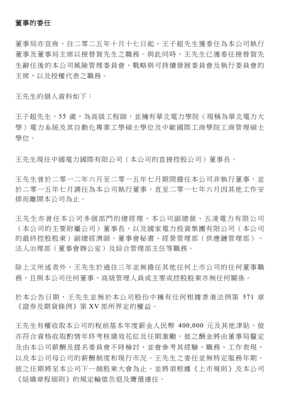 中国电力发布公告称,自2025年10月17日起,王子超获委任为公司执行董事、董事局主席及授权代表,亦获委任为公司风险管理委员会、战略与可持续发展委员会及执行委员会的主席。
