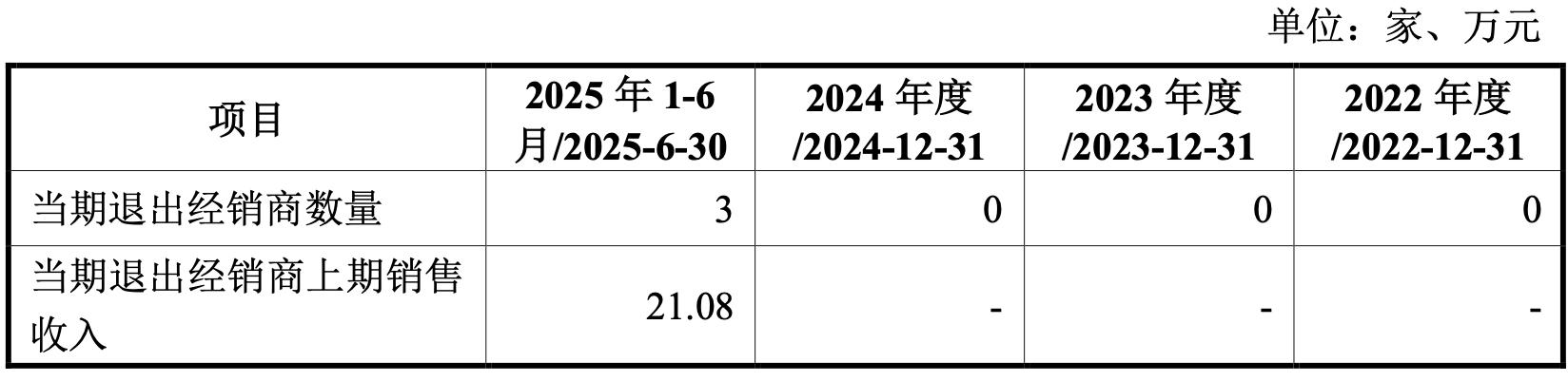 2025年1-6月,有三家经销商客户退出,公司称,该等经销商均为OBM成品业务经销商,2024年采购额均低于10万元,金额较小,因销售情况不佳,公司与该等经销商终止经销合作关系。