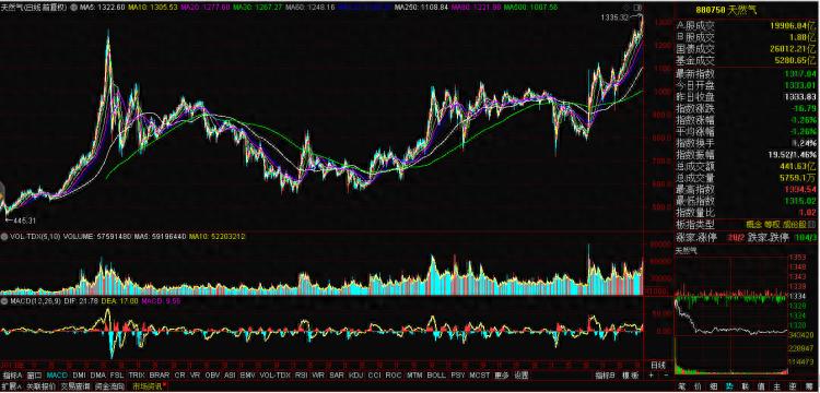 通达信数据显示:天然气指数10月份以来连续拉升,不仅突破了2015年6月的1270.18点峰顶,而且最高见到了1335.32点。具体到个股上则不乏长春燃气、国新能源、石化油服等剧烈震荡的股票,而龙头股中国石化和中国海油则是稳步攀升。