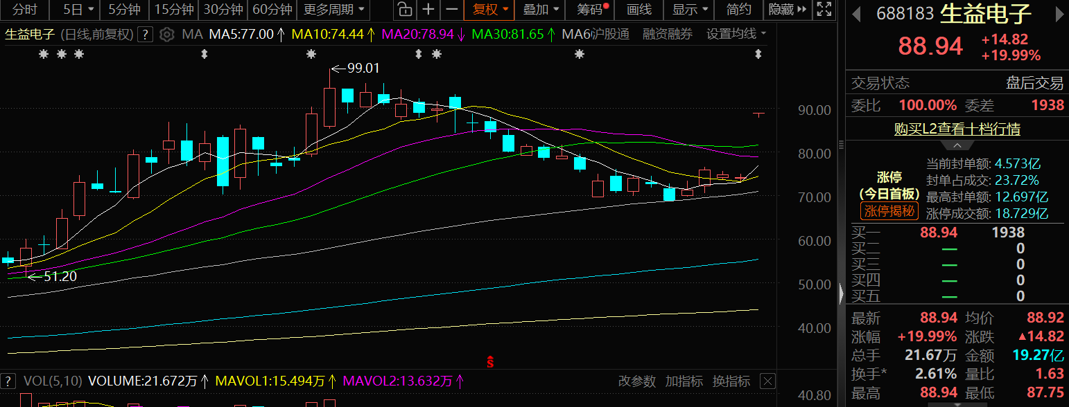 受此消息影响,昨日生益电子20CM涨停,报收88.94元/股。