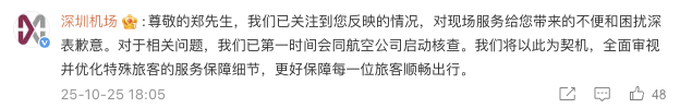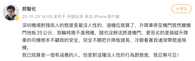 10月25日,歌手@郑智化 在微博发文怒斥深圳机场,“深圳机场对残疾人的态度是最没人性的,远机位就算了,升降车停至机门居然离机门地板25公分,我轮椅推不进飞机,腿也没办法跨进机门,更恶劣的是操纵升降车的司机根本不顾我的安全,完全不愿把升降板提高,冷眼看着我连滚带爬进飞机。 我已经算是一个有涵养的人,但是对这种没人性的行为跟态度,我忍无可忍!”随后,@深圳机场 在评论区致歉,称对现场服务带来的不便和困扰深表歉意。对于相关问题,已第一时间会同航空公司启动核查。