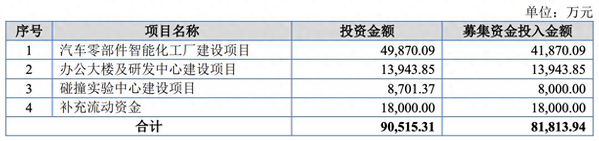 招股书显示,本次泓毅股份拟募资8.18亿元用于汽车零部件智能化工厂建设项目、办公大楼及研发中心建设项目、碰撞实验中心建设项目及补充流动资金。其中汽车零部件智能化工厂建设项目募集资金投入金额为4.19亿元,1.8亿元补充流动资金。